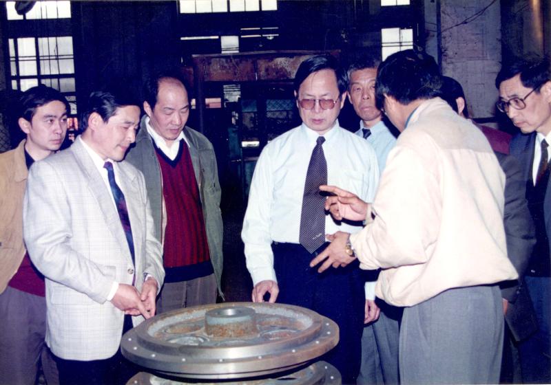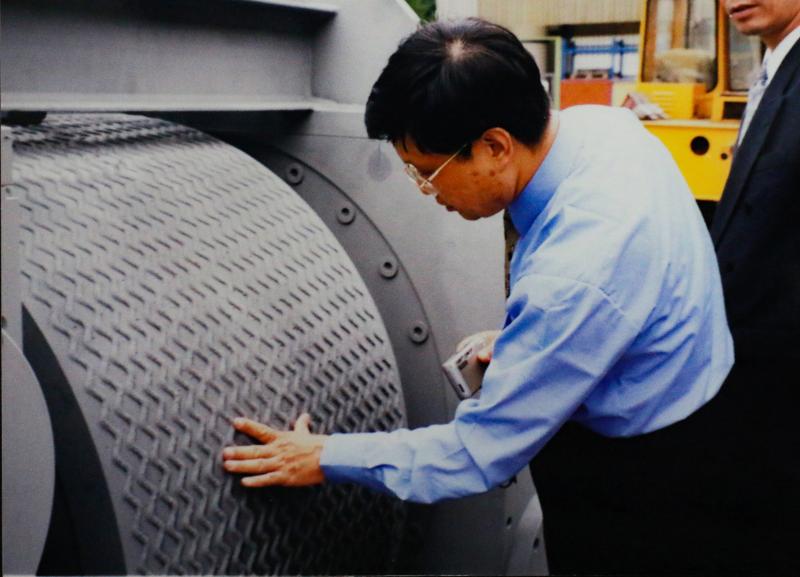 1999年,合肥院技術專家和領導們出國考察交流學習。圖為粉磨專家包瑋在研究輥壓機設備。